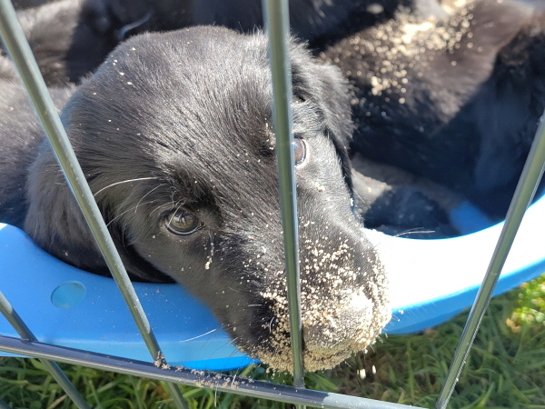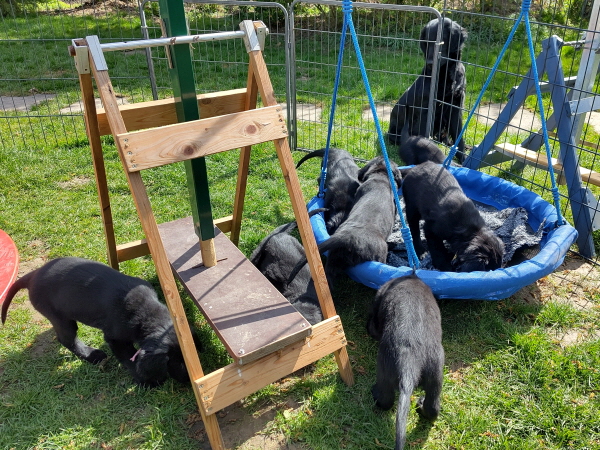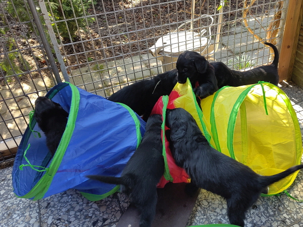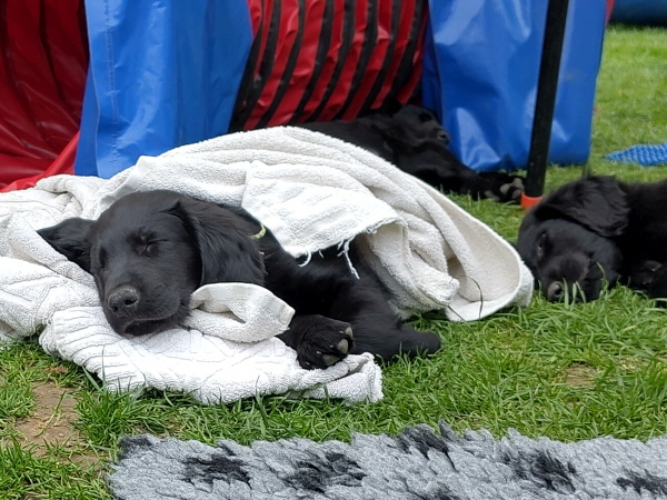 Alle Welpen sind ausgeglichen und taff. Mitte der Woche dröhnte der Probealarm los: Terrassentür auf und .... nix und. Die Welpen blieben ruhig, einige schliefen weiter - cool.