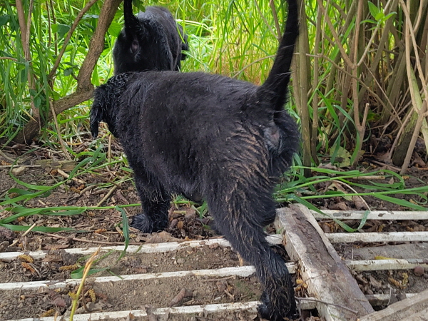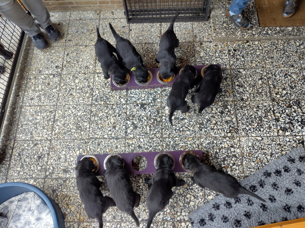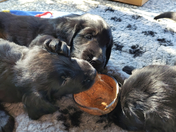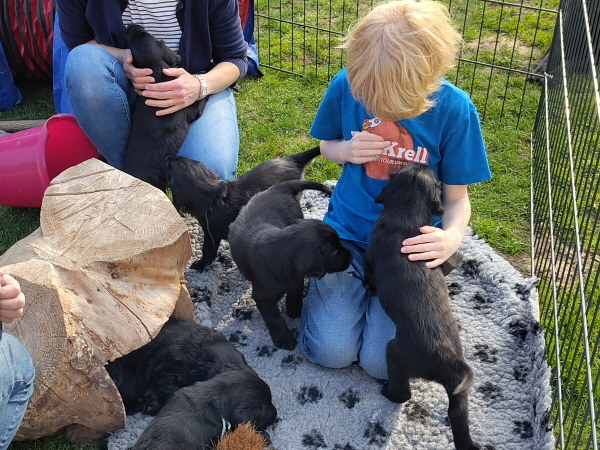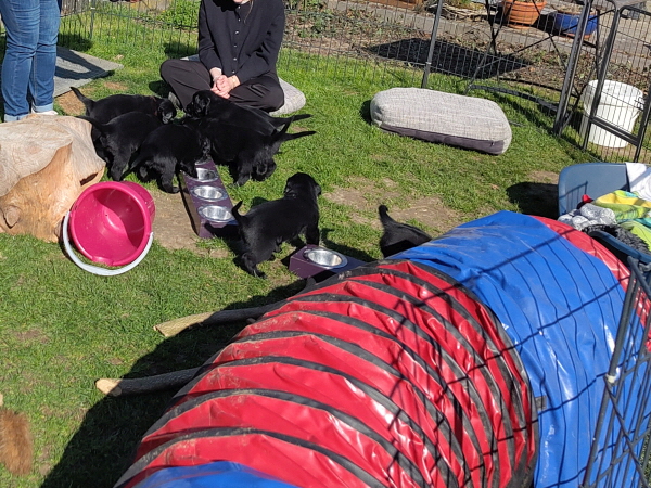 29.03.2026: Nun am Ende der 7.Lebenswoche der Welpen wiegen sie alle jeweils etwa 5 Kilogramm. Alle sind putzmunter und wohlauf. Es waren wieder aufregende Tage, an denen sie viel Besuch bekommen haben. Natürlich begeistern sie die Menschen, sie sind aber auch bezaubernd, manchmal. Manchmal auch nicht. Dann knabbern sie alles an, beißen in Finger und Füße, ziehen Schuhriemen auf und so ein Quatsch. Oder sie wollen lieber raus und zetern und schreien in ihrem Auslauf. Leider war das Wetter nicht so toll, so dass nur wenig in den Garten konnten.