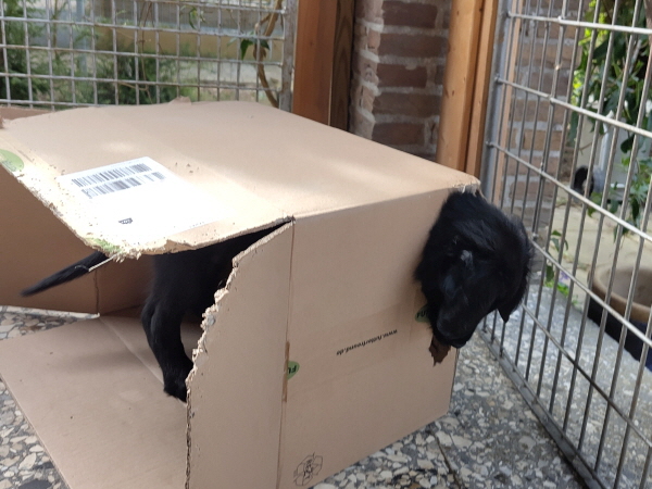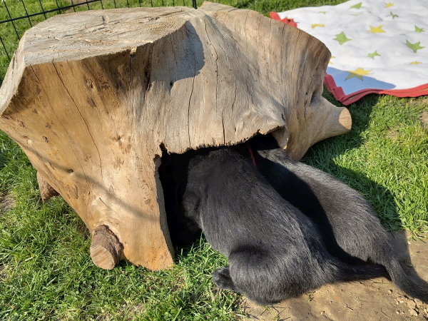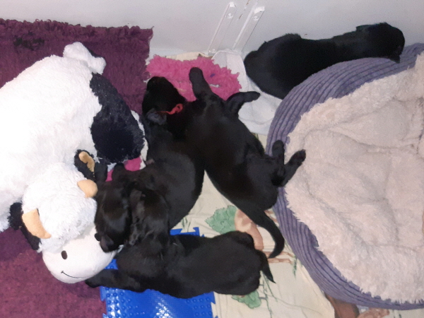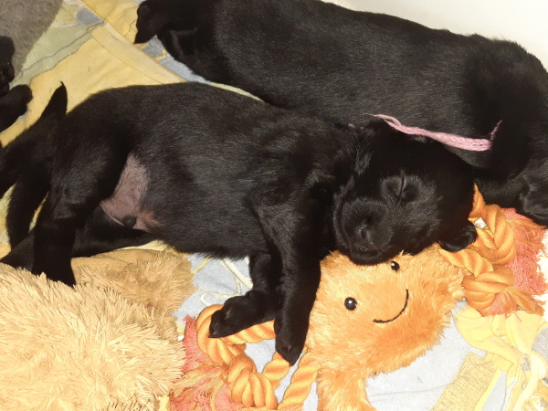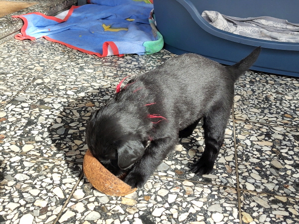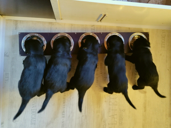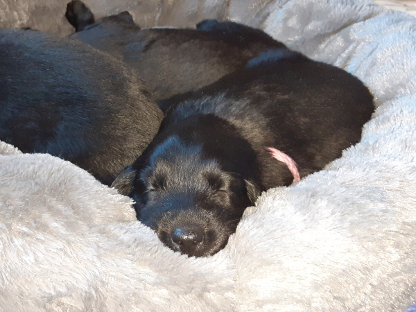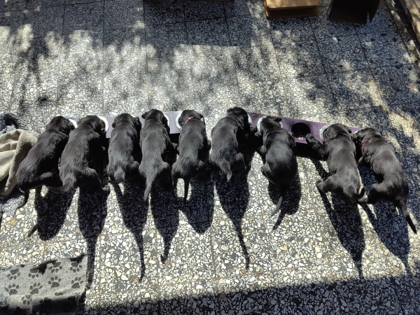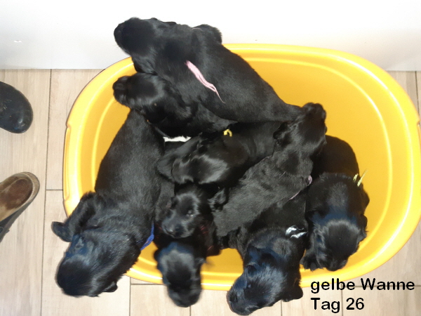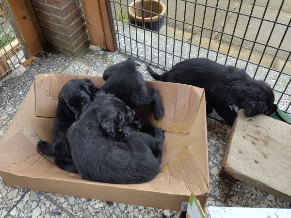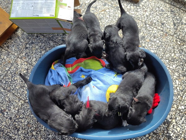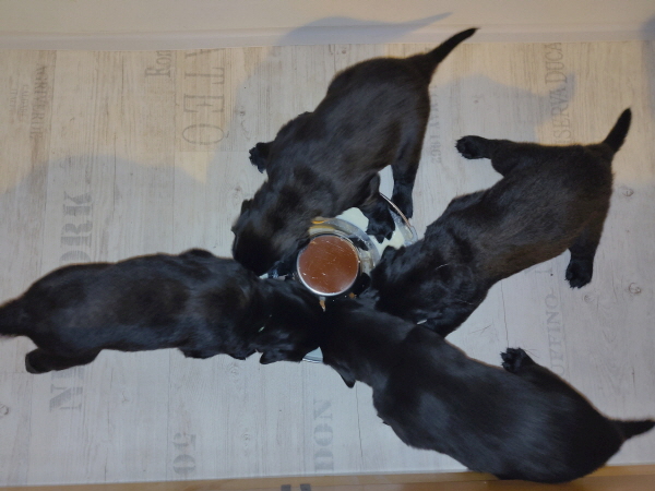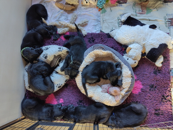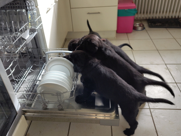Die Welpen sind weiterhin putzmunter, kräftig, pfiffig und agil. Sie wiegen nun 6000 Gramm und mehr. Noch zweimal schlafen und es wird schon ein wenig leerer in der Wurfkiste.