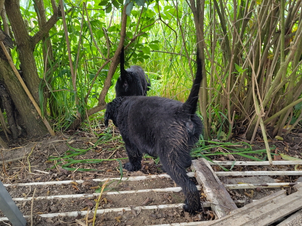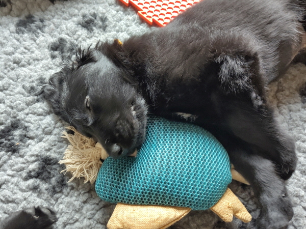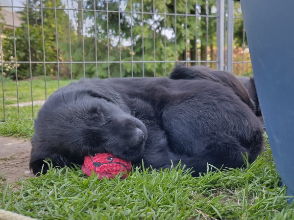 Bei uns ist Ruhe eingekehrt. Etwas wehmütig werden Auslauf innen und außen und die Wurfkiste abgebaut. Fryda fühlt sich pudelwohl. Sie läuft, mal mit den Großen, mal alleine, durch Haus und Garten und hat Spaß. Dann ist sie aber auch müde und schläft ausführlich.