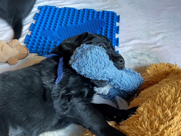 08.03.2026: Na, was wohl? Sie waren entzückt. Erwachsene Menschen mit Dauergrinsen vor der Wurfkiste, genau wie wir. Und es wurde gestreichelt, gekuschelt und gespielt. Es gibt aber auch viel zu sehen: wie sie nun spielen, kämpfen, knurren und manchmal zart bellen. Sie ringen mit Spielzeug und miteinander, sie sprinten kurz los, klettern auf und über die Kissen. Und sie beißen mit den spitzen Zähnchen in Finger und Zehen - autsch. Und sie durften zum ersten Mal raus auf die Terrasse. Das war spannend. Soviel Platz und so fremd. Aber sie haben es tapfer und gut gemeistert, sehr toll. Die Großen waren auch dabei und waren sehr lieb. Im Anschluss waren die Kleinen ordentlich müde. In der Wurfkiste und dem kleinen Auslauf wurde man dann noch mit den Menschen gekuschelt, um dann friedlich einzuschlafen.