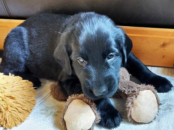 14.04.2026: Nun sind alle Welpen, bis auf Fryda, in ihren neuen Familien angekommen. Zum Abschied haben sie neben dem Heimtierausweis und einer Futterration noch einen ‘Knochen’ mit dem Wurfnamen Famous und eine Hülle für den Heimtierausweis mit dem eigenen Namen drauf erhalten. Dazu gab es noch einen kleinen Spielzeugbären von Herrn Lehmann. Herr Lehmann ist ein Rüde aus unserem C-Wurf, also ein Großonkel der Kleinen. Er und seine Menschen sind uns sehr verbunden, hatten die Kleinen besucht und für jeden ein Geschenk mitgebracht.