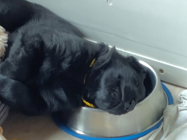 Da gibt es einen Welpen, der die Klasse eigentlich besonders begrüßen möchte, leider aber dabei eingeschlafen ist. Ja, so sind sie, die Welpen: erst rumtoben und dann umkippen und einschlafen.