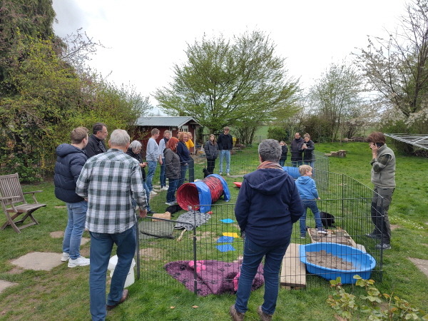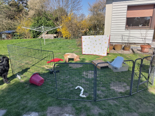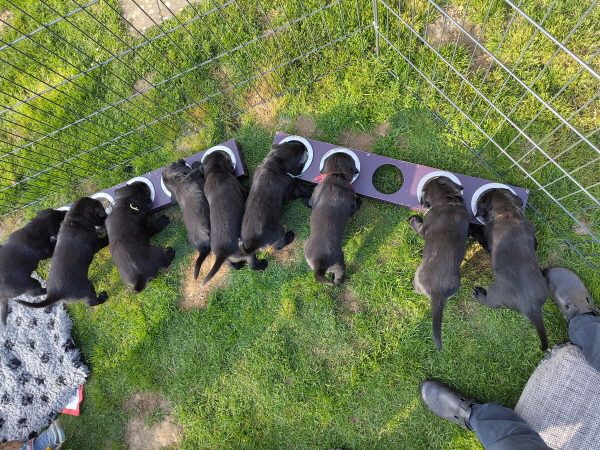 18.03.2026: Na hier ist was los. Die Welpen sind in die 6.Lebenswoche gestartet und mopsfidel. Sie nehmen weiter gut zu, wiegen zwischen 3400 und 3600 Gramm. Sie sind weiter unerschrocken und neugierig. Der Auslauf im Wohnzimmer wurde erweitert und gerne angenommen. Aber auch das Wohnzimmer und die Küche sind sehr interessant und werden bei Gelegenheit eingehend inspiziert. Da erforschen sie jede Ecke und nehmen gerne die Liegeflächen der Großen in Beschlag. Die müssen derweil draußen warten. Und sehr gerne geht’s auf die Terrasse. Dort locken neue Spielgeräte: Wackelscheibe, Wackelbrett, Kartons... Und die Neun nehmen alles wie selbstverständlich mit. Wir können nur staunen. Und dann war heute das Wetter schön. Also Auslauf auf dem Rasen aufgebaut, ausgestattet und rein mit den Welpen. Die zauderten, fast 2 Sekunden, und dann wurde das neue Reich in Beschlag genommen. Sie sind begeistert.