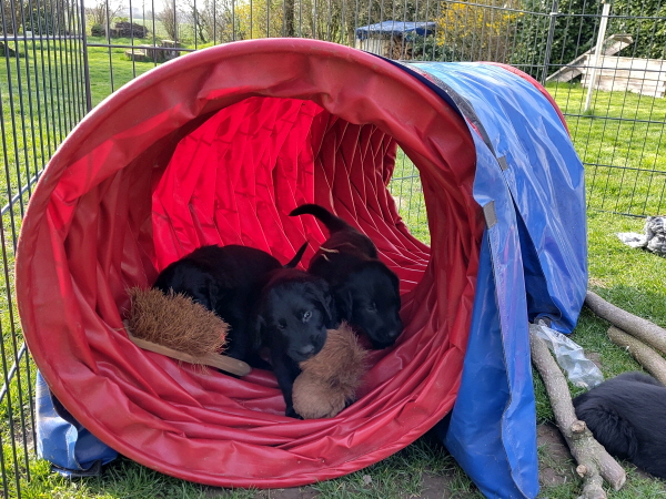 22.03.2026: Und sie lieben es, das Spielen draußen auf dem Rasen: rennen, springen, toben, raufen, erkunden, schnuppern, zerren, aber auch schmusen und kuscheln. Der neue große, rote Tunnel wird gut angenommen zum Durchlaufen und Verstecken. Auch ein Gitter zum Drüberlaufen wird kaum als neu erkannt. Das ist schon eine tolle Truppe. Sehr gerne laufen sie auch durch Wohnzimmer und Küche. Wie schön in den Kudden der großen Hunde zu toben. Die Großen müssen dabei draußen warten. Es wäre zu wuselig und unübersichtlich, wenn die auch noch dabei wären. Die Welpen wachsen weiter schön und nehmen gut zu. Sie wiegen nun je um die 4000 Gramm. Da braucht ein Erwachsener schon zwei Hände zum Anheben.