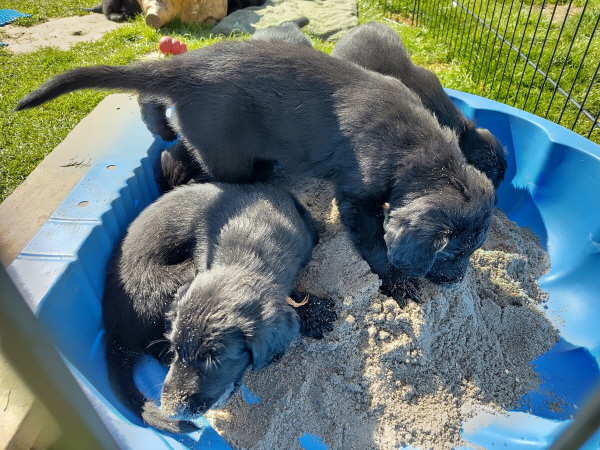 01.04.2026: Kaum zu glauben, jetzt hat schon die achte Lebenswoche der Welpen begonnen. Sie wachsen weiter schön und nehmen ordentlich zu: 5100 - 5500 Gramm. Die Besucher der letzten Tage staunten, wie groß sie geworden sind und hatten Freude beim Kuscheln und Knuddeln. In den letzten Tagen konnten die Kleinen zeitweise wieder in den Gartenauslauf, das gefällt ihnen. Heute wurde eine Sandmuschel aufgebaut und sofort eingeweiht - so ein Spaß. Morgen kommt die Tierärztin zum Drüberschauen, Impfen und Chipen. Bestimmt wird auch sie begeistert sein. Und am kommenden Samstag gibt’s hier das große Treffen, alle ‘Neuen’ kommen zu uns. Da lernt man sich kennen, tauscht sich aus und erfährt noch einiges Nützliches. Und sie erfahren, wer denn demnächst ihr Zuhause bereichert - oder so. Jedenfalls wird es ein schöner Tag.